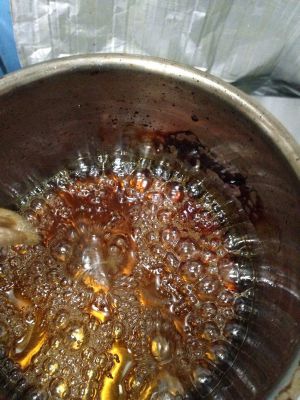 颜色变深后用离火(一会后会更深色),倒入布丁杯中(不要立即倒,太烫冷热不匀怕把杯子爆裂