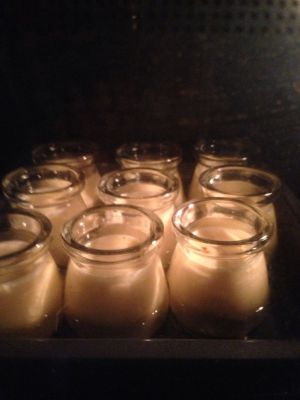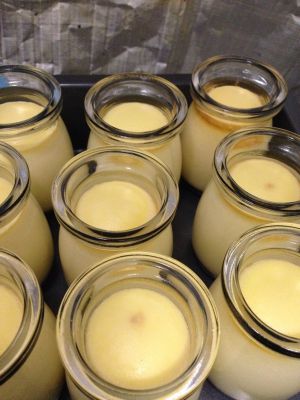 温牛奶中边打边慢慢倒入蛋液,然后过滤三遍(做出来更细腻)倒入杯子,烤箱预热后,放进装入盘子的布丁杯(座水一半左右)160度40分钟。