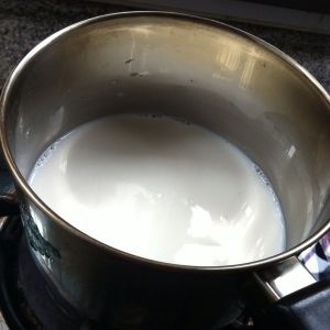 准备好图上三种食材。牛奶入锅加热沸腾,倒入淡奶油搅拌均匀,不停搅拌并加热至沸腾。