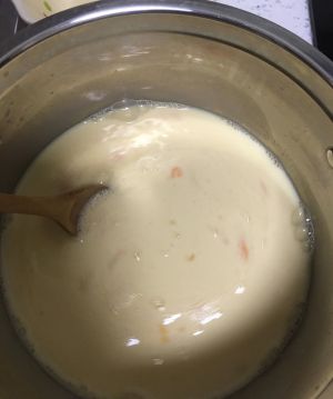 待牛奶稍凉,将鸡蛋慢慢倒入牛奶中,并不停搅拌
