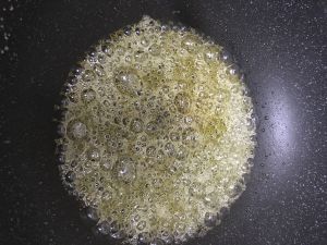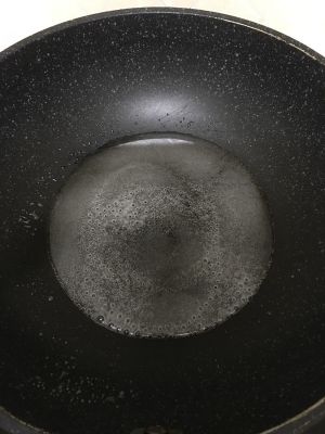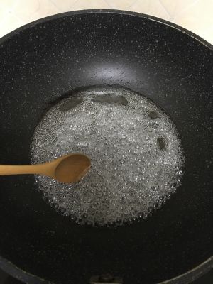 小火熬糖,白砂糖充分融化后会出现大气泡,这是水分在蒸发,然后气泡会变小就是要变色了,轻轻晃动锅子让糖的颜色更均匀,观察到颜色变为棕红的琥珀色就及时离火