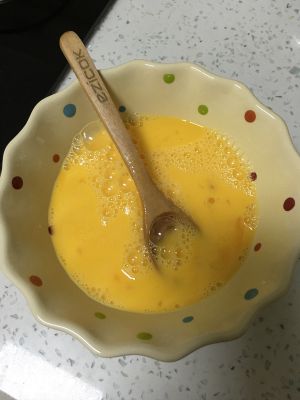 然后将鸡蛋2个打入碗中,用蛋抽搅打至蛋清和蛋液完全融合,蛋液表面有一层细碎泡沫就好了。