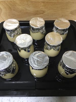 烤箱180度预热10分钟,取出烤盘加入适量热水,然后将装好布丁液的布丁碗放入烤盘中。