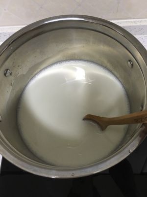 两盒牛奶倒入锅中,再加80g的白砂糖,加热到白糖熔化,不能煮开锅