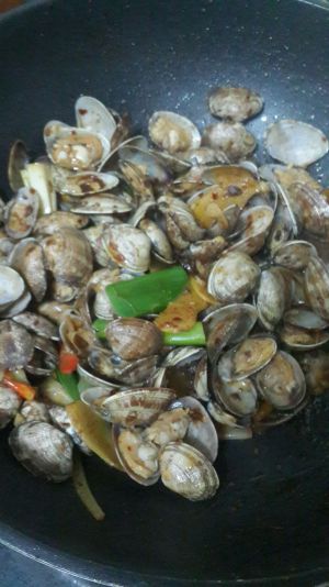 放耗油,酱油,盐,炒均匀后盖盖,不用加水,花蛤会自己出汤,焖大概10分钟,好了,出锅了