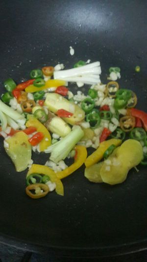 将葱姜蒜切末,将青椒,红辣椒切成末,锅里放少许油,差不多温度放入切好的葱姜蒜辣椒末炒出香味,放入化蛤爆炒。