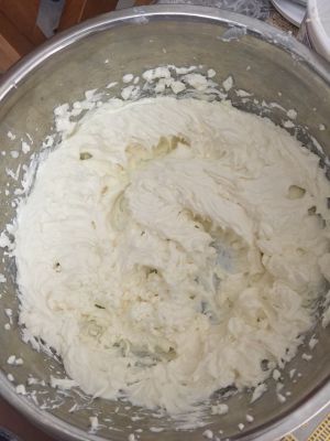 打发的奶油取1/3放入芝士糊中搅拌均匀,然后再把剩余打发的淡奶油全部加入,翻拌混合呈光滑的提拉米苏糊。