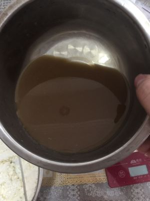 煮沸后的糖水缓慢加入到蛋黄液中,继续搅打8分钟左右,此时蛋黄温度和手心温度差不多即可