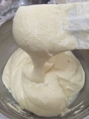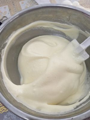 将1/3蛋白加入蛋黄中搅拌,最后再将所有的蛋白加入搅拌,利用翻拌与切拌,此配方不怕消泡,可以用来练手。