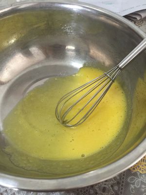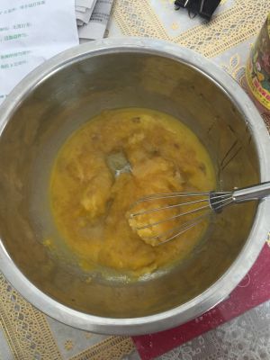 2个蛋黄加20g细砂糖搅打,至砂糖融化,泛白。
