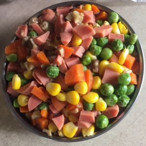1.把各种配料切成小丁 用小锅加油翻炒一下(不必炒熟) 加入盐 酱油调味