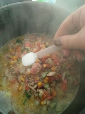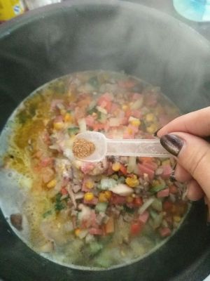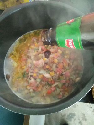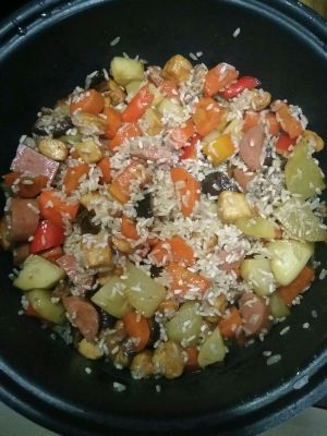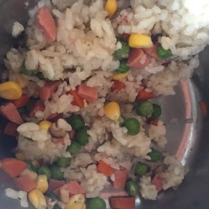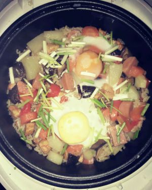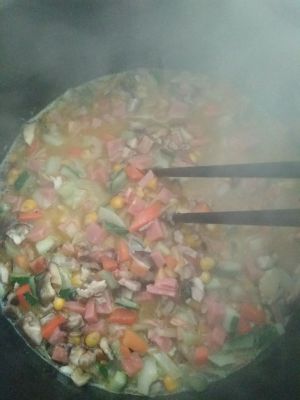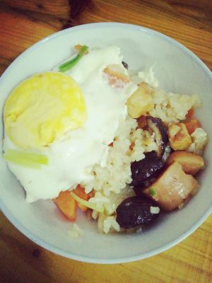 把米洗净,比蒸饭少放一点水,倒入炒的好食材,放入适量的盐