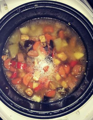 先放油,炒鸡肉,可以放少点油,后面加入火腿肠和香菇炒的时候再加一点油,最后放入胡萝卜和土豆炒,油就要再放一点,然后再加入盐(可多放点,因为后面放在电饭煲里面就不要加盐了),再放老抽调色,最后放鸡精和耗油翻炒均匀,不需要炒多久,因为还要放到电饭煲里面煮的。