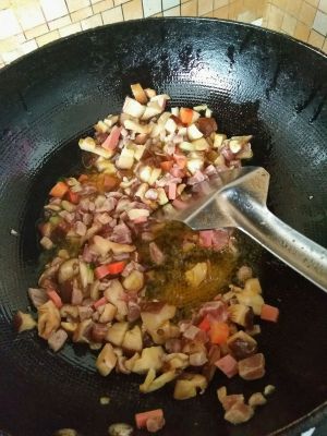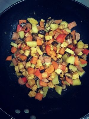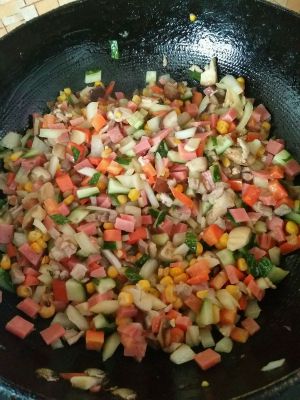 热油锅,葱花爆香,先后放入胡萝卜丁、西葫芦丁、蘑菇丁、木耳丁、火腿丁 翻炒,可加适量酱油翻炒