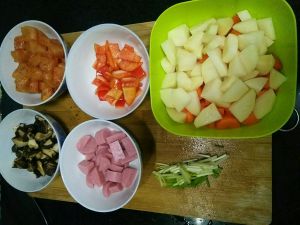先把土豆,胡萝卜,火腿肠,辣椒,香菇切丁,葱切段备用,鸡肉是我菜市场买的,里面已经调好味道了,如果是没有调味的鸡肉就把鸡肉切丁,放料酒,耗油,盐,生抽,姜腌制二十分钟