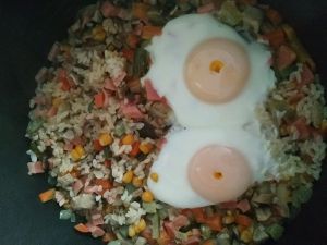 放入炒好的鸡蛋,熟米饭,最后放入菠萝丁