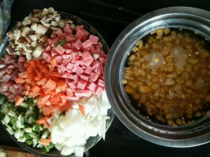 将香菇,火腿肠,胡萝卜,圆葱,瘦肉,黄瓜,切丁备用