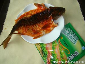 烤肉料加水调成调料汁(1:1),均匀的涂抹在鱼上,腌制1-2个小时。