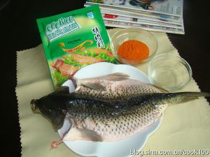 钳鱼背部划开两边花刀,用盐、料酒、海椒面、五香粉、孜然等调味料码匀