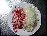 锅中倒入少量油,大火加热至4成热时,放入培根碎,改成中火煸炒出油后,放入洋葱碎继续炒出香味,待洋葱炒成透明色后关火。