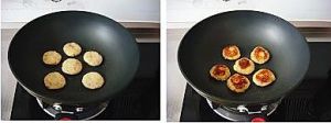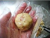 取大丸子大小的一块土豆泥放入手中,先揉圆再压成一个个的小饼。