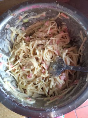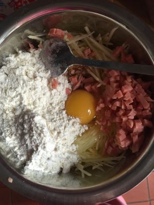 土豆泥、胡萝卜、和剔下来的鳕鱼肉混合、加上一点点一点点盐(其实也可以不加、因为鳕鱼本身就有淡淡的咸味)再加上一小撮胡椒粉、最后再加上棒子面混合均匀、揉成软面团