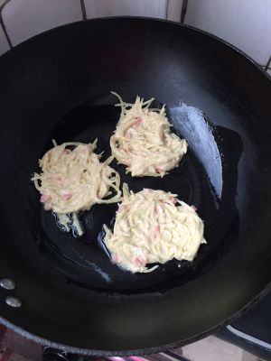 锅中放油少许,用小勺放入土豆糊,再用小勺弄成圆形