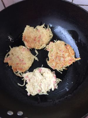 下锅,等土豆凝固成饼再翻面哦