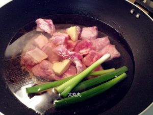 小排放入清水中,加入姜块,葱煮沸去除血水后捞出洗净。