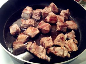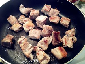 排骨沥干水分,热油锅,放排骨进锅,边煎边炒至两面稍金黄;
