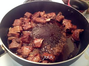 加入焯水后的排骨,炒到微微焦黄。重点来了:1勺料酒2勺醋3勺白糖4勺生抽5勺水,根据排骨多少稍作调整,刚好没过排骨就行。再加2颗八角1小块桂皮2片香叶,大火烧开后转小火焖。