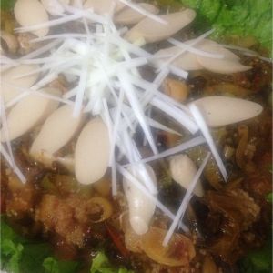 起锅烧油下葱姜蒜爆香,加入豆瓣酱、盐、鸡精、生抽调味后加入400g清水煮开备用。