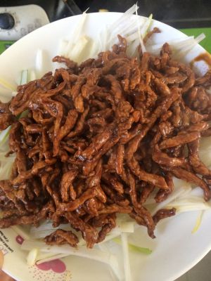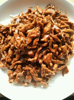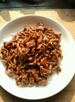 待汁全部粘满肉丝时出锅铲入装有葱丝的盘中。
