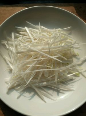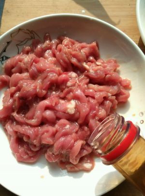 里脊肉顺着筋路切丝.加入料酒.生抽.豆粉.蛋清.盐伴匀码味十分钟。