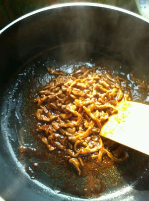 锅留底油放入葱姜水.白糖.甜面酱烧沸后放入肉丝翻炒。
