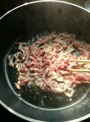 起油锅,油温热后放入肉丝、同时以迅雷不及掩耳之势倒入少许白醋、翻炒。