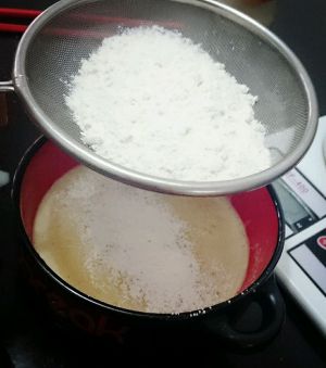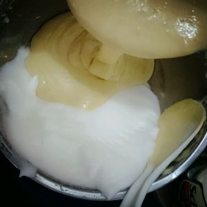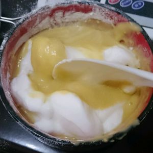 鸳鸯奶茶冷却后倒入蛋黄液拌匀!