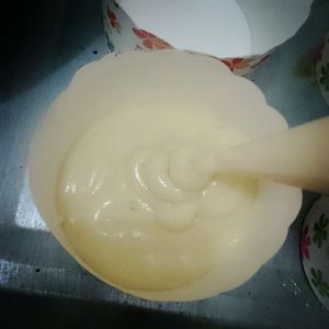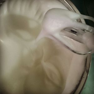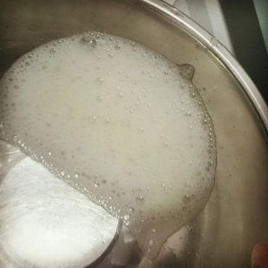 这个时候预热烤箱150°。开始用打蛋器低速打发蛋清至蛋清变成泡沫加三分之一白糖(35g的总白糖三分之一不必那么精确差不多就成!)