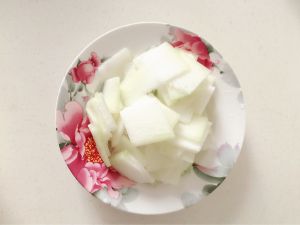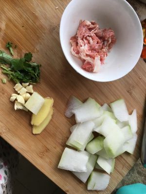 冬瓜去皮去瓤洗净切片,葱切一段,姜切两片,蒜拍一两瓣,羊肉片洗一下去血水,加料酒、几滴生抽,一点盐腌三五分钟