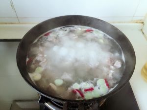 再放点盐,别问我放多少,我做菜比较随意,哈哈,大火煮5分钟改小火炖,就是炖,别停……