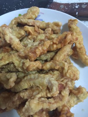 锅中放油,三成热加入里脊条,微黄捞出,油温四成热,重新倒入锅里,炸至金黄捞出,爱吃椒盐的,撒椒盐可直接吃