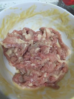 鸡蛋料酒打散,放入里脊条,抓均,放入淀粉面粉,一点点苏打粉(没有也可不加),拌均,一定要抓均匀了,不能有小面疙瘩