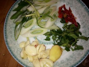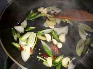热锅凉油,步骤一中除香菜不放,其余全部爆香;