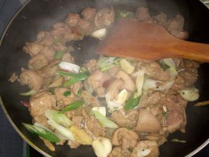 油锅烧热放葱翻炒一分钟(炒葱的时候,火不要太大,要不然葱会炒糊哦),加生抽、料酒、白糖,翻炒几下。