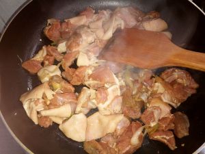 放入步骤四里的食材,加入白酒,胡椒粉,辣椒酱,生抽和香醋,翻炒;