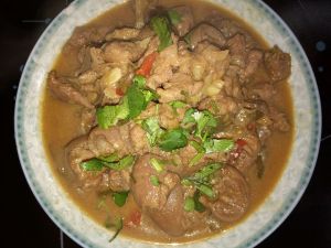 热水,将羊肉放入锅内翻炒两下,放料酒烹一下,少放一点点老抽,放入洋葱翻炒,最后放香菜,翻炒两下,加盐鸡精,十三香调味,可以放少许芝麻,根据个人喜好