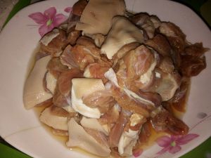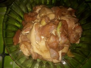 加入几片姜和葱段去腥,加盐,生抽,老抽,胡椒粉,料酒,淀粉,糖,蛋清,抓匀,腌制一夜(或20分钟),倒出血水;