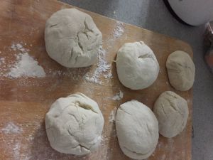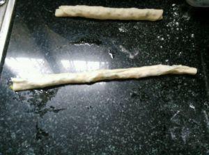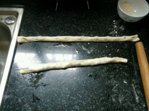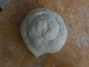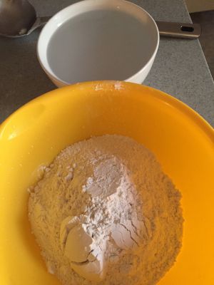 一碗面粉加盐加冷水和成面团…水要慢慢的加…因为一点点水就可以把面团弄得很湿…和任何面团都是这样…水慢慢加