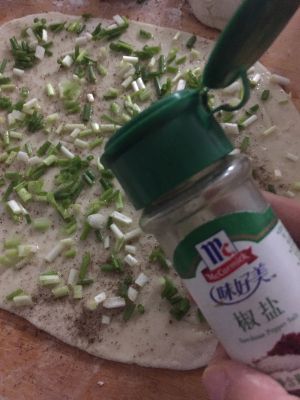 把剂子擀到最薄,撒上葱花,盐,我喜欢加一些椒盐,口感味道更丰富