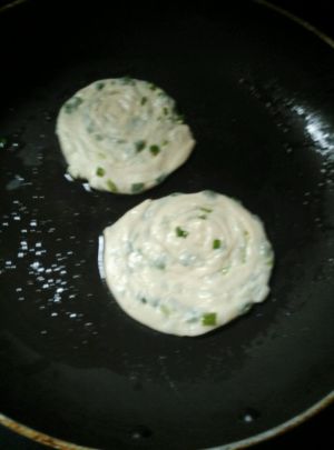 热锅加少许油,然后淋入一勺半的分量(视自己的不粘锅和勺子大小来定)